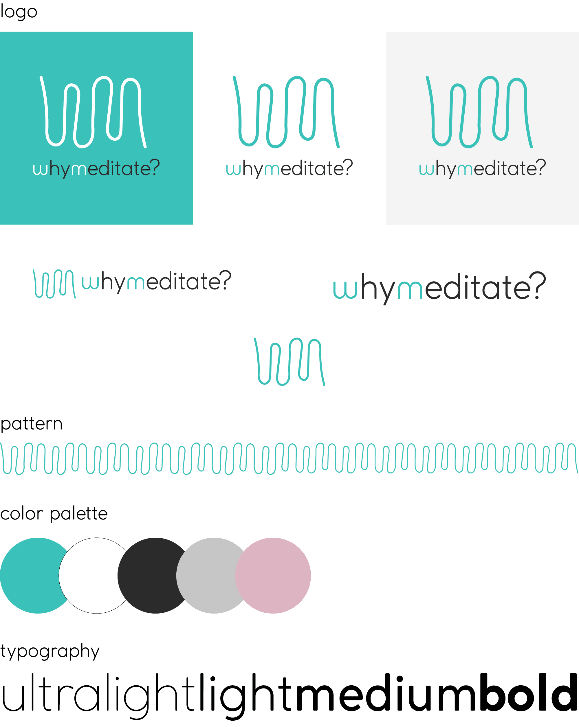 The brand identity revolves around accessibility, simplicity, and a soothing user experience. The logo, featuring a unique blend of breath wave patterns forming an abstract "W" and "M," represents the essence of breathwork in meditation. Aqua blue hues throughout the branding evoke calmness and tranquility.