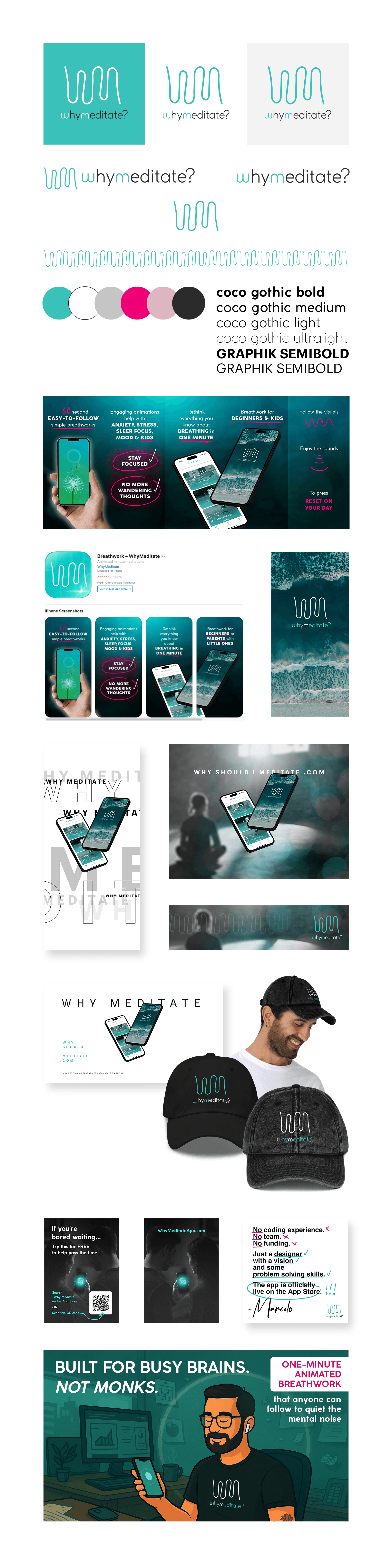 The brand identity revolves around accessibility, simplicity, and a soothing user experience. The logo, featuring a unique blend of breath wave patterns forming an abstract "W" and "M," represents the essence of breathwork in meditation. Aqua blue hues throughout the branding evoke calmness and tranquility.